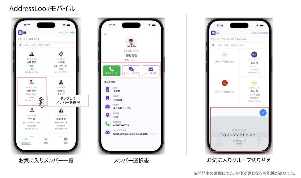 スマホアプリからAddressLookのアドレス帳へアクセスし、直接電話やメール、SMS送信ができます。