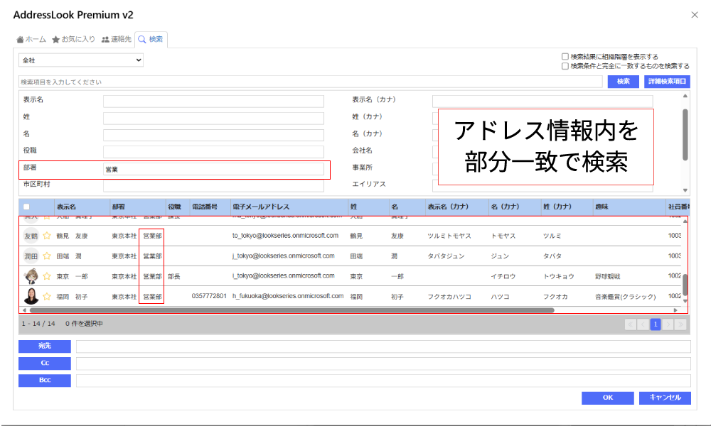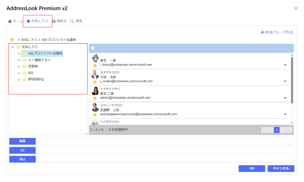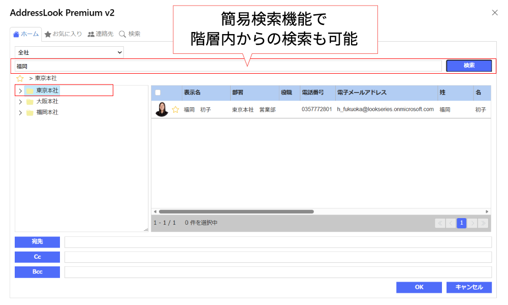 AddressLookは、階層表示の他、個人連絡先(Exchange)に登録している宛先、お気に入り、検索から宛先選択が可能です。