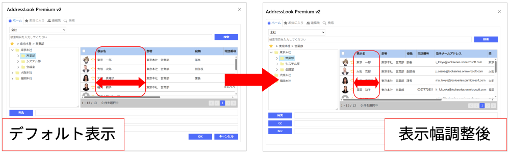 アドレス帳内の各項目は、表示幅を自分で変更できます。