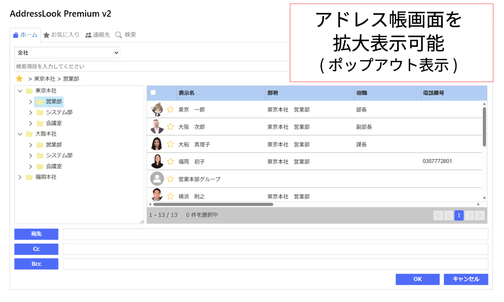 ✓ お気に入り/個人連絡先/検索機能も使えて、宛先選択を使いやすく