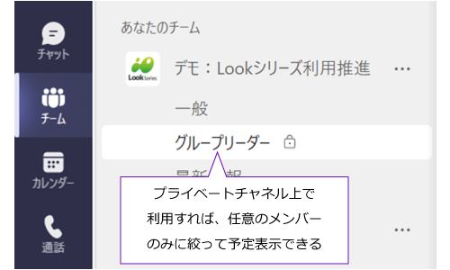 プライベート(秘密の)チャネルでもScheduleLook Liteからメンバー予定を確認できます。