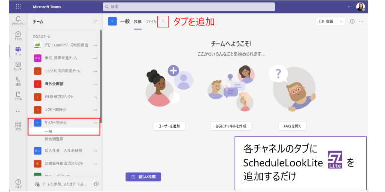 ご契約後の利用開始にあたっては、チームのチャネル内からタブにScheduleLook Liteのアプリを追加します。チームメンバーの代表者がScheduleLook Liteを追加するだけで、他メンバーの画面にも反映されます。