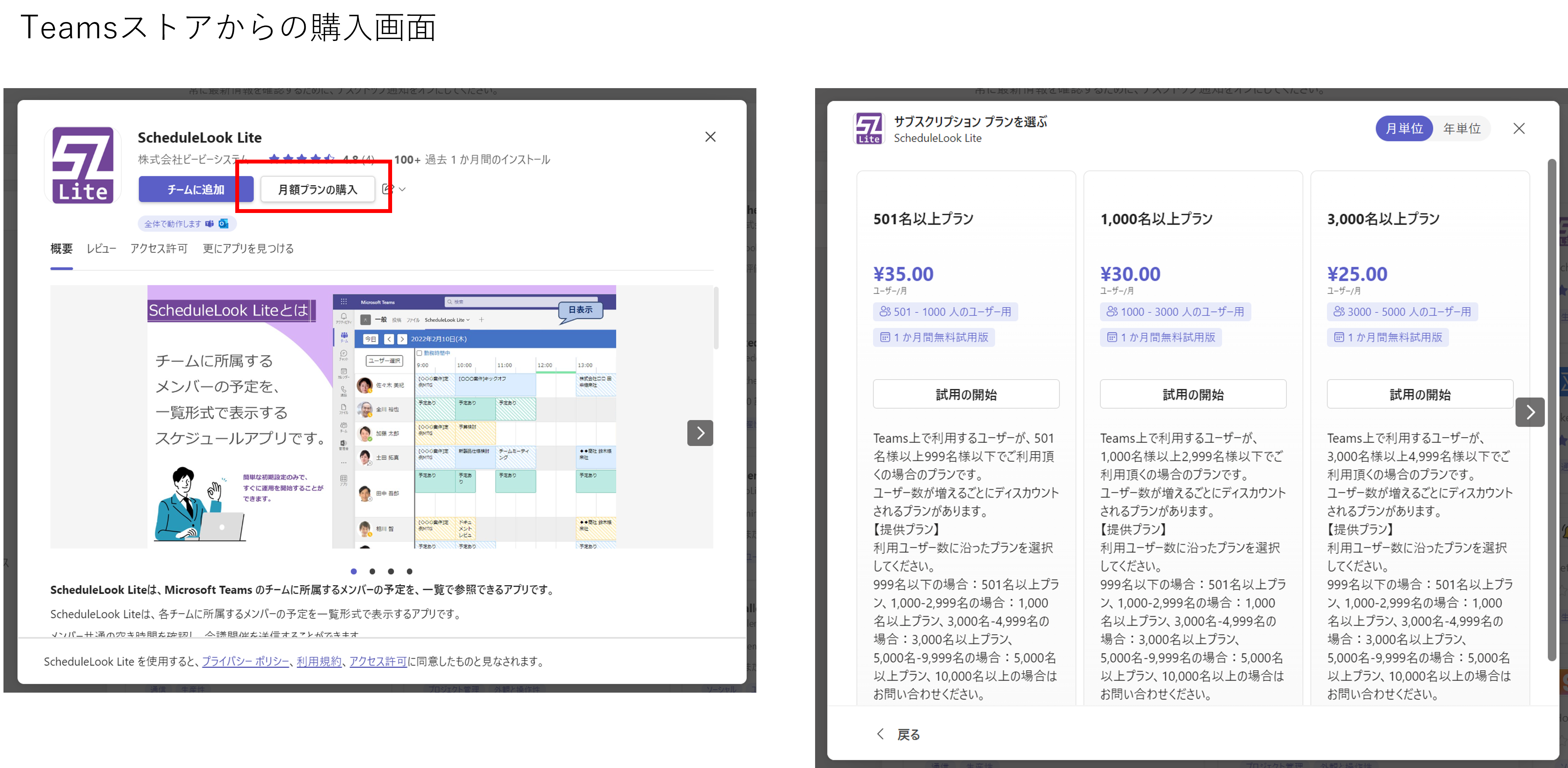 AppSource/Teamsストアから購入が可能になりました。ストアから「ScheduleLook Lite」のご利用人数にそったプランを選択し、購入にお進みください。30日間は無料でご利用可能です。(30日以内に解約すれば費用はかかりません)