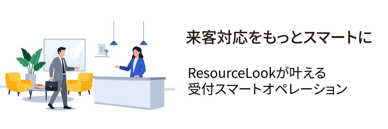 会議室予約管理システム「ResourceLook」は、予約データと来客・受付管理をひとつにつなぐことで、取り次ぎ時の手間を軽減、スマートな来客対応を実現します。