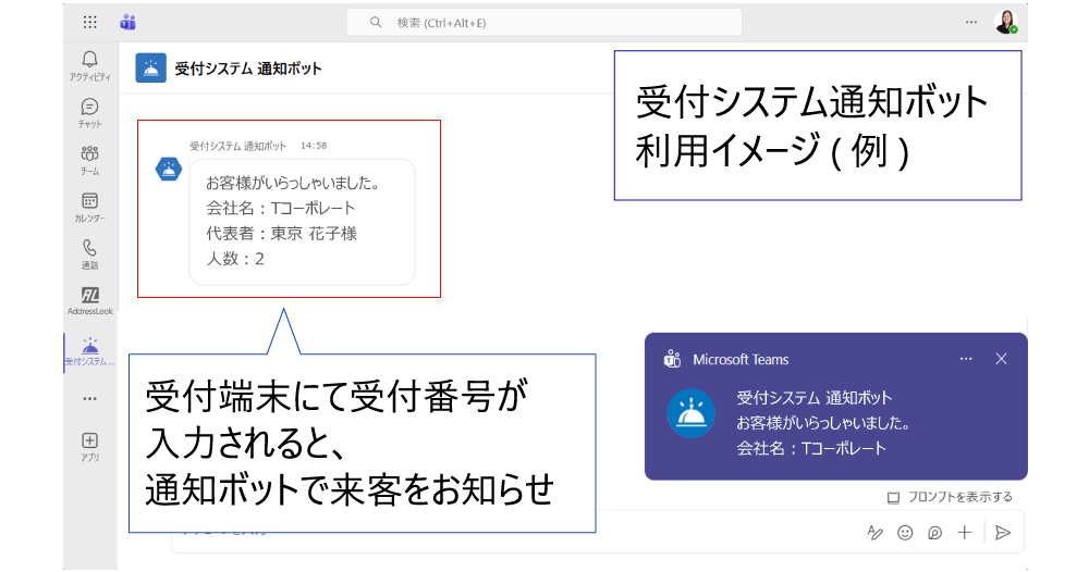 受付端末を利用することで、”待たせない受付”を実現します。エントランスにて、来訪者が受付番号を入力すると、Teams通知ボットが担当者へ直接お知らせし、受付が自動的に完了します。