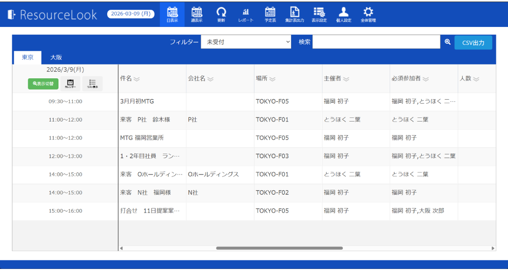 また、会議室利用予定一覧は、CSV出力も可能。 受付対応の記録簿として保存できます。