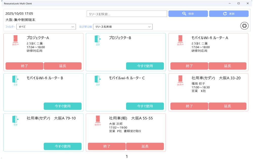 複数会議室の管理を、端末1台で行える機能です。ResouceLookでは、各会議室に端末を設置して予約管理ができますが、この集中制御端末を使うと、複数会議室の予約状況を集中的に把握できます。