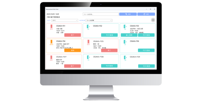 集中制御端末からは、会議室の利用状況(空き/使用中)・予約状況が一覧で分かります。