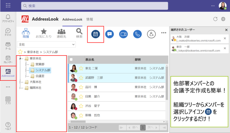 階層型アドレス帳 AddressLookは、Teams上でのチャット・予定作成・通話時に顔写真の見える組織ツリーが利用できます。部署を跨いだ会議予定の作成も、簡単に行えます。 任意のお気に入りグループ単位での宛先管理をすることで、予定作成がより簡単になります。