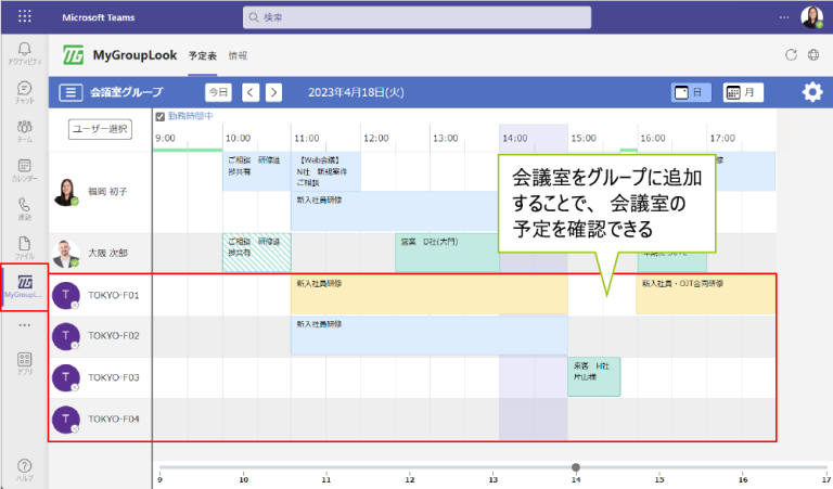 任意のグループ単位でのスケジュール管理・日程調整ができるMyGroupLookでは、会議室を含めたグループを作成することで、会議室の予定を一覧表示することができます。